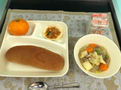 今日の献立は、豚肉と野菜のスープ、かわりピザ、みかん、黒糖パン、牛乳でした。美味しくいただきました。