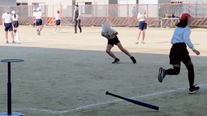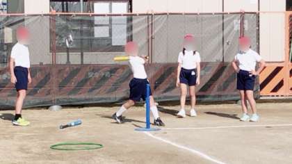 体育で、ティーボールのゲームをしていました。なかなか迫力あるバッティングフォームですね。