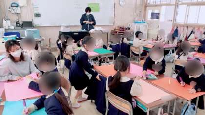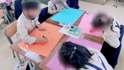 図工の学習です。色画用紙にマジックペンを使っていろいろな線や形を描いています。そのうち、画用紙いっぱいに鮮やかな模様ができてきます。