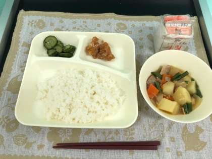 今日の献立は、揚げ鷄のネギダレかけ、豚肉とじゃがいもの煮物、きゅうりの赤紫蘇和え、ご飯、牛乳でした。ごちそうさまでした。