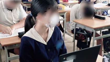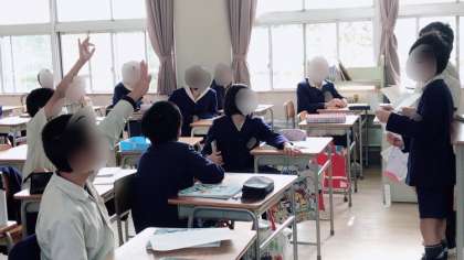 英語の学習です。前に立った友だちが英語で問題を出し、それに答える形の学習です。