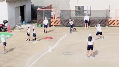 体育でティーボールのゲームをしていました。攻める方も守る方も、大きな声かけを互いにしながら楽しんでいました。