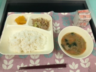 今日の献立は、豚肉と野菜の炒め物、イワシのつみれ汁、カボチャのういろう、ご飯、牛乳です。いただきます。
