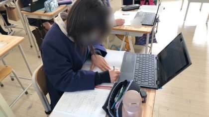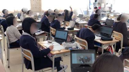 社会科の学習で、タブレット端末を使って日本の伝統工芸品について調べていました。