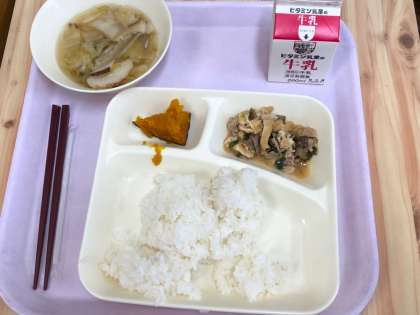 今日の献立は、豚肉と干ズイキの味噌煮、うすくず汁、焼きカボチャの甘みつがけ、ご飯、牛乳でした。ごちそうさまでした。