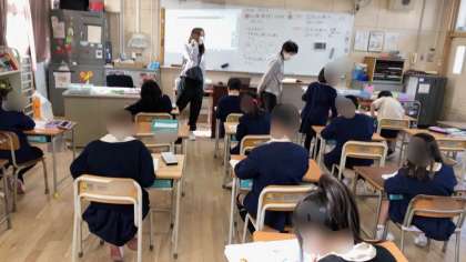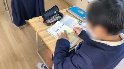 算数の学習で図形を書く練習をしていました。教科書に定規を上手く使って書き込んでいました。