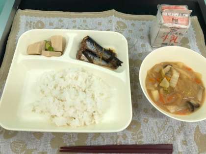 今日の献立は、イワシの生姜煮、味噌汁、高野豆腐の煮物、ご飯、牛乳でした。おいしかったです。ごちそうさまでした。