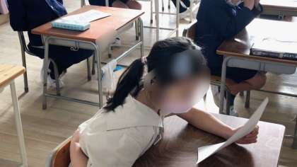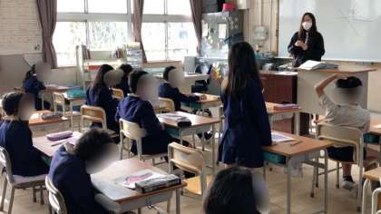 生活科で描いたさつまいもの絵を見ながら芋掘りの時の様子を思い出していました。
