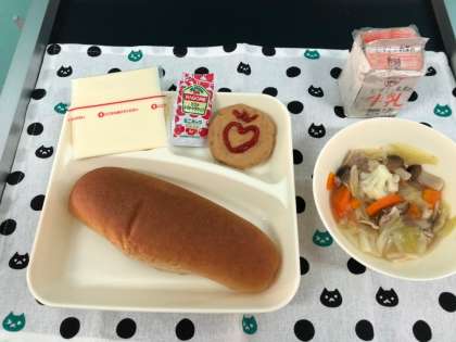 今日の献立は、豆腐ハンバーグ、カリフラワーのスープ煮、スライスチーズ、黒糖パンでした。美味しくいただきました。ごちそうさまでした。