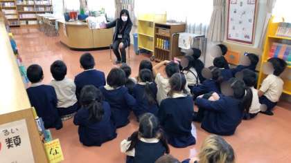図書の時間です。図書館補助員さんに絵本の読み聞かせをしてもらいました。皆、どんどん物語に入り込んでいってました。