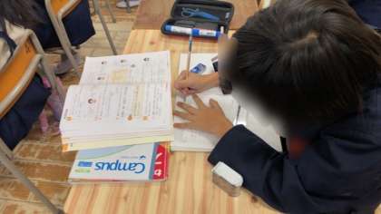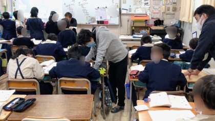 算数の学習で、教科書の問題に取り組んでいました。できた人から先生に丸つけしてもらいに行ってました。