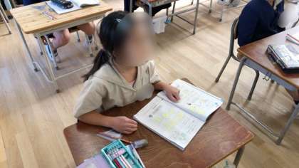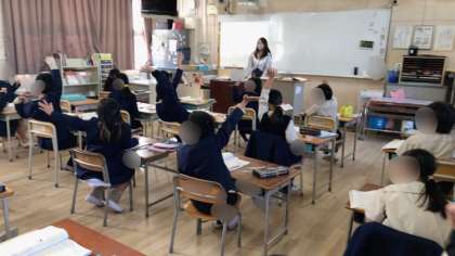 算数で、正方形と長方形についての学習です。白板に映し出される図形がどちらかをみんなで確認していました。
