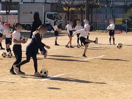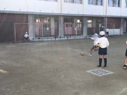 体育の学習です。サッカーあそびでシュートの練習をしていました。