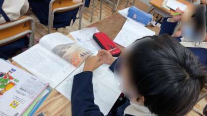 国語の学習です。物語文「ごんぎつね」を読み解いています。今日はごんが兵十に罪滅ぼしの届け物をしている場面でした。