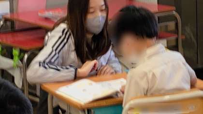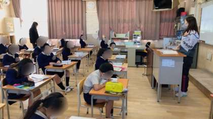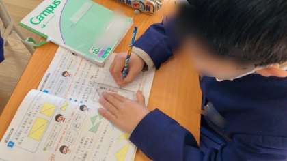 算数の学習で、正方形を描いています。定規を使って丁寧に作画します。上手くいかない子も先生からアドバイスをもらいながら頑張っています。