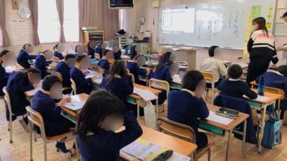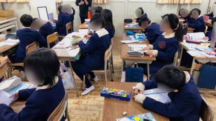 下段は4年生、新しい漢字ドリルや計算ドリルなどを配っていました。配られたらそれぞれに名前を書いていました。