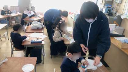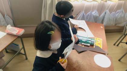 図工の学習です。雪だるまを作ります。線を意識して部品を切り抜いていました。