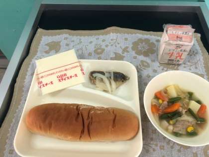 令和5年最初の献立は、鯵のレモンマリネ、てぼ豆のスープ煮、スライスチーズ、黒糖パン、牛乳です。今年もよろしくお願いします。いただきます。