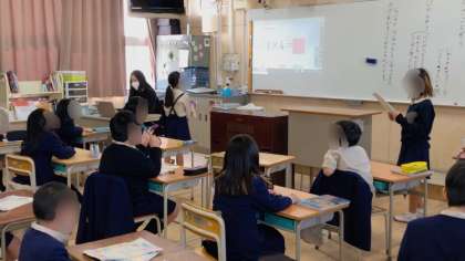 下段は2組、算数で九九のテストをしていました。一人ひとりがモニターに映し出された式の答えを言っていました。