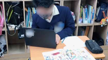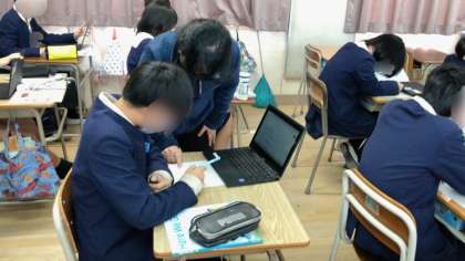 英語の学習です。冬休みの思い出を英語の紹介文にしていました。タブレット端末も使って考えていました。