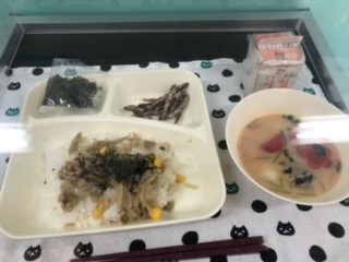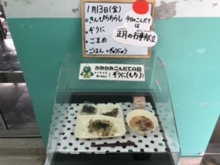 きんぴらちらし、雑煮、ごまめ、牛乳です。お正月には、新しい年の始まりを祝って「今年も健康に過ごせますように」と願って食べる料理がたくさんあります。「雑煮」と「ごまめ」もお正月によく食べられる料理の一つです。雑煮は、その年の実りと幸せをもたらすといわれている年神様へのお供え物を新年最初に汲んだ「若水」と新年最初に灯した火で煮込んで食べたのが始まりと言われています(諸説あります)。また、「ごまめ」は「まめ」という言葉が息災とか「たっしゃ(健康)」という意味があるところから健康を願って食べたとされています(これも諸説ありますが)。
