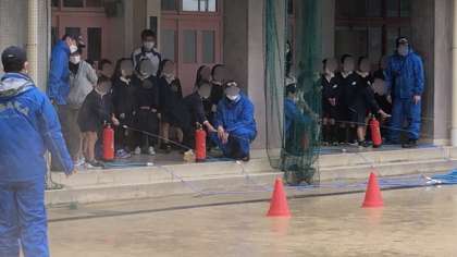 消火体験は、実物と同じ消火器(中身は水に入れ替えている)を使って的に当てる体験です。皆、よく狙って頑張っていました。途中で1・2年生は入れ替わってどちらも体験できるようにしています。