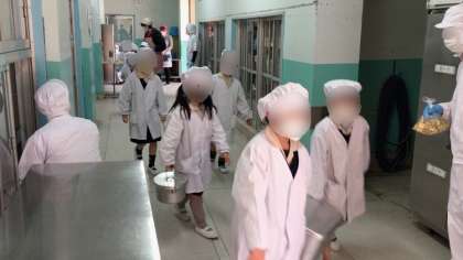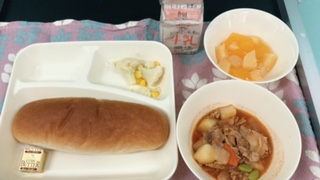 今日の献立は、豚肉と野菜のケチャップ煮、カリフラワーのピクルス、フルーツゼリー、コッペパン、バター、牛乳です。いただきます。