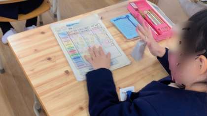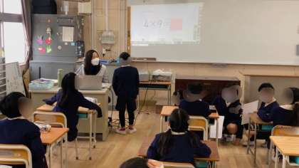 算数の学習で、九九のテストです。白板に映し出される九九の答えを素早く答えます。基準をクリアしたら合格として九九カードにメダルシールが貰えます。