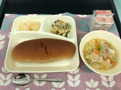 献立は、帆立のグラタン、スープ、和梨(カット缶)、黒糖パン、牛乳でした。美味しくいただきました。ごちそうさまでした。