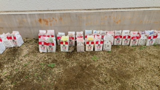 生活科の学習で氷をつくります。牛乳パックに色水をいれ、それを凍らします。水に絵の具を混ぜ、色水を作ったら牛乳パックを校舎の陰になるところへ置いておきます。今夜はとても寒くなる予報なので凍るかな?