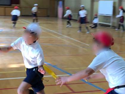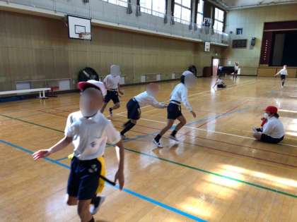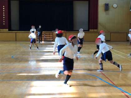 体育の学習です。しっぽとりおにで身体を温めています。腰にタグをつけてそれを取り合う鬼ごっこです。楽しく準備運動ができます。また、タグラグビーの練習にもなります。