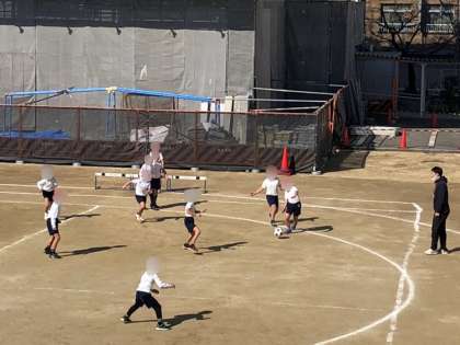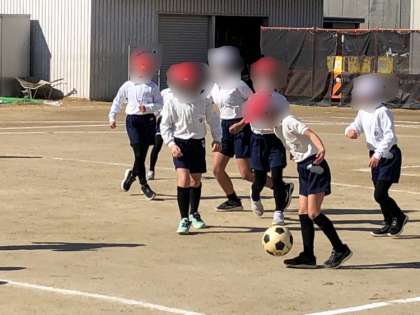 体育の学習で、ラインサッカーのゲームを楽しんでいました。