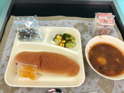 今日の献立は、ビーフシチュー、ブロッコリーとコーンのサラダ、ミニフィッシュ、コッペパン、マーマレード、牛乳でした。ごちそうさまでした。