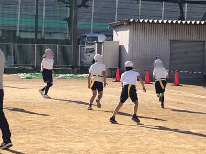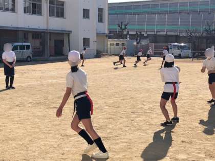 体育で、タグラグビーをしています。それぞれのチームで作戦を考えて練習しています。