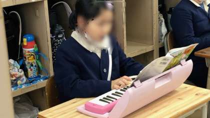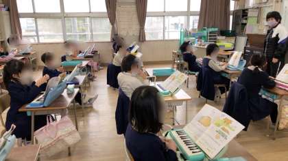 音楽の学習で、鍵盤ハーモニカの練習をしていました。列毎にパートを分けて練習していました。