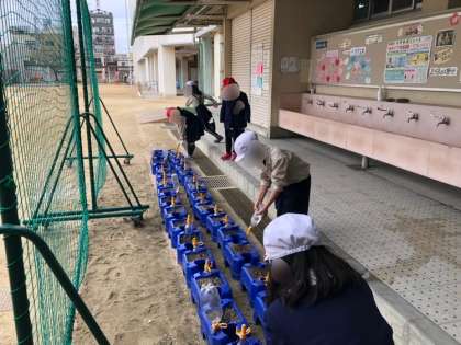 1年生が生活科で植えたチューリップの球根が給食室前廊下のところに並べてあります。3月にきれいな花が咲くよう、水やりを頑張ってます。