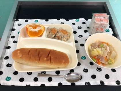 今日の献立は、押し麦のグラタン、豚肉と野菜のスープ、いよかん、おさつパン、牛乳でした。ごちそうさまでした。