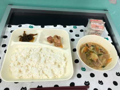今日の献立は、マグロの甘辛焼き、豚汁、茎ワカメの佃煮、ご飯、牛乳でした。美味しくいただきました、ごちそうさまでした。
