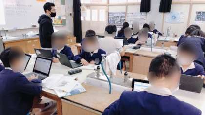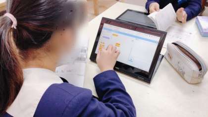 理科の学習で、プログラミングをしていました。光センサーを動かすプログラムをつくろうと頑張っていました。