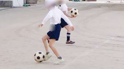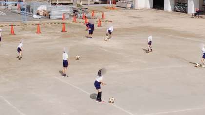 体育のボール運動あそびです。サッカーのドリブルやパスなどを楽しんでいました。