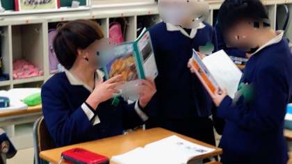 国語の学習です。手塚治虫の伝記からその生き方や考え方を読み取り、自らの考えを深めていきます。今日は、先生の範読を聴き、初手の感想を友だちと共有しています。