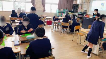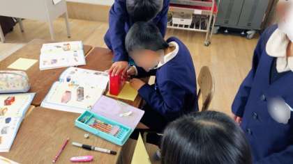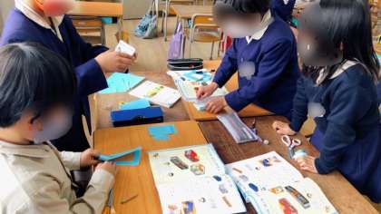 算数で図形の学習です。班で協力して四角い箱を作ります。箱のそれぞれの面を紙に写してそれを貼り付けて四角い箱(直方体ですね)にします。