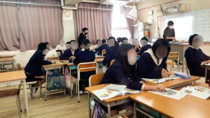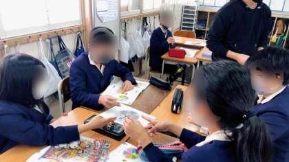 書かれたルーレットを回して、出た英文に自分のこと入れて班のみんなに発表するというゲームをしていました。