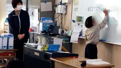 算数で100までの数の計算の単元です。白板の問題の答えを発表していました。友だちの意見をしっかり聞いている姿が印象的でした。