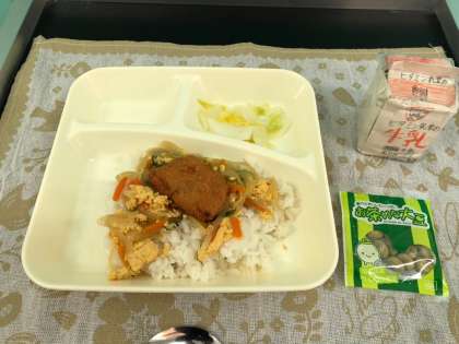 今日の献立は、カツ丼、白菜の甘酢和え、抹茶大豆、牛乳です。いただきます。