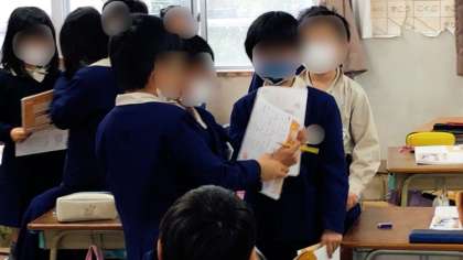 道徳の時間です。学習して考えたことを友だち同士発表し合い、意見を交流しあっています。