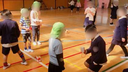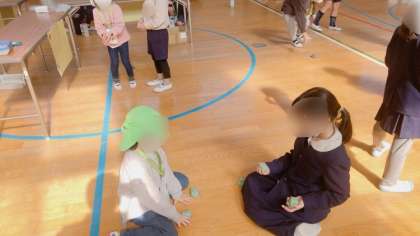 「縄跳び」「お手玉」「だるま崩し」「けん玉」の四つのあそびコーナーをつくってそれぞれで保育所子どもたちをもてなしました。