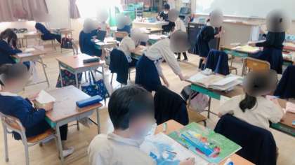 図工の学習です。丁寧に色を塗って絵画の作成中です。
