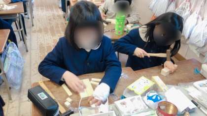 図工の学習で、カナヅチで釘を打って作品を作っていました。