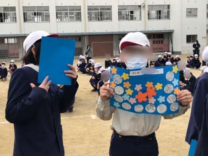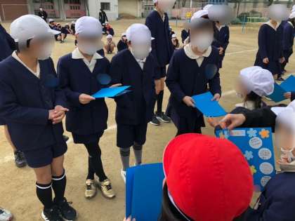 在校生から6年生へお礼の寄せ書きのプレゼントです。1年生から手渡しました。